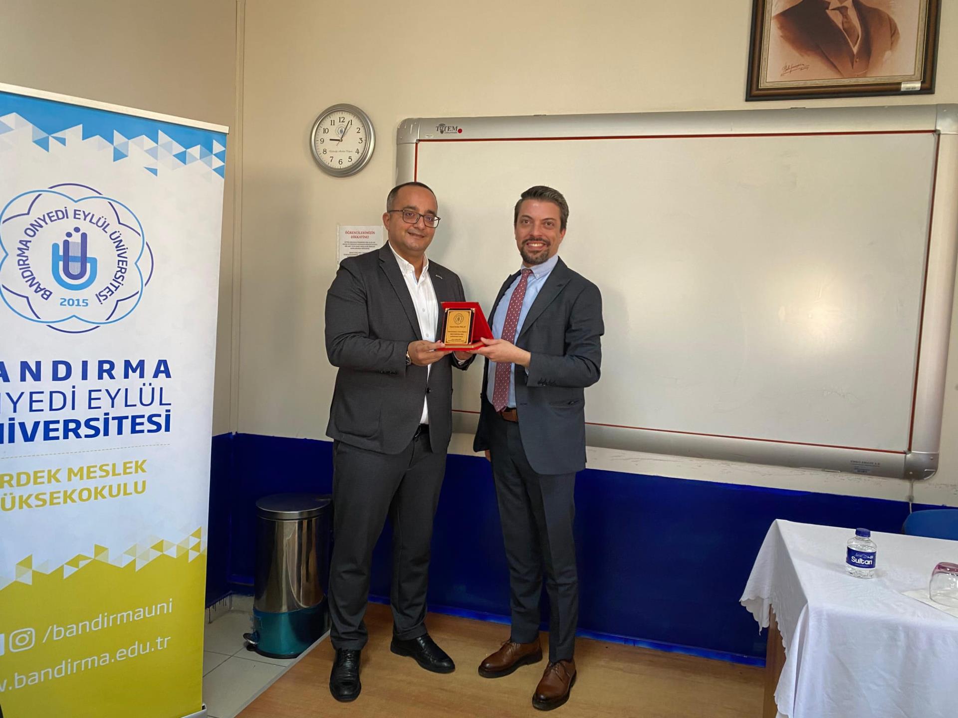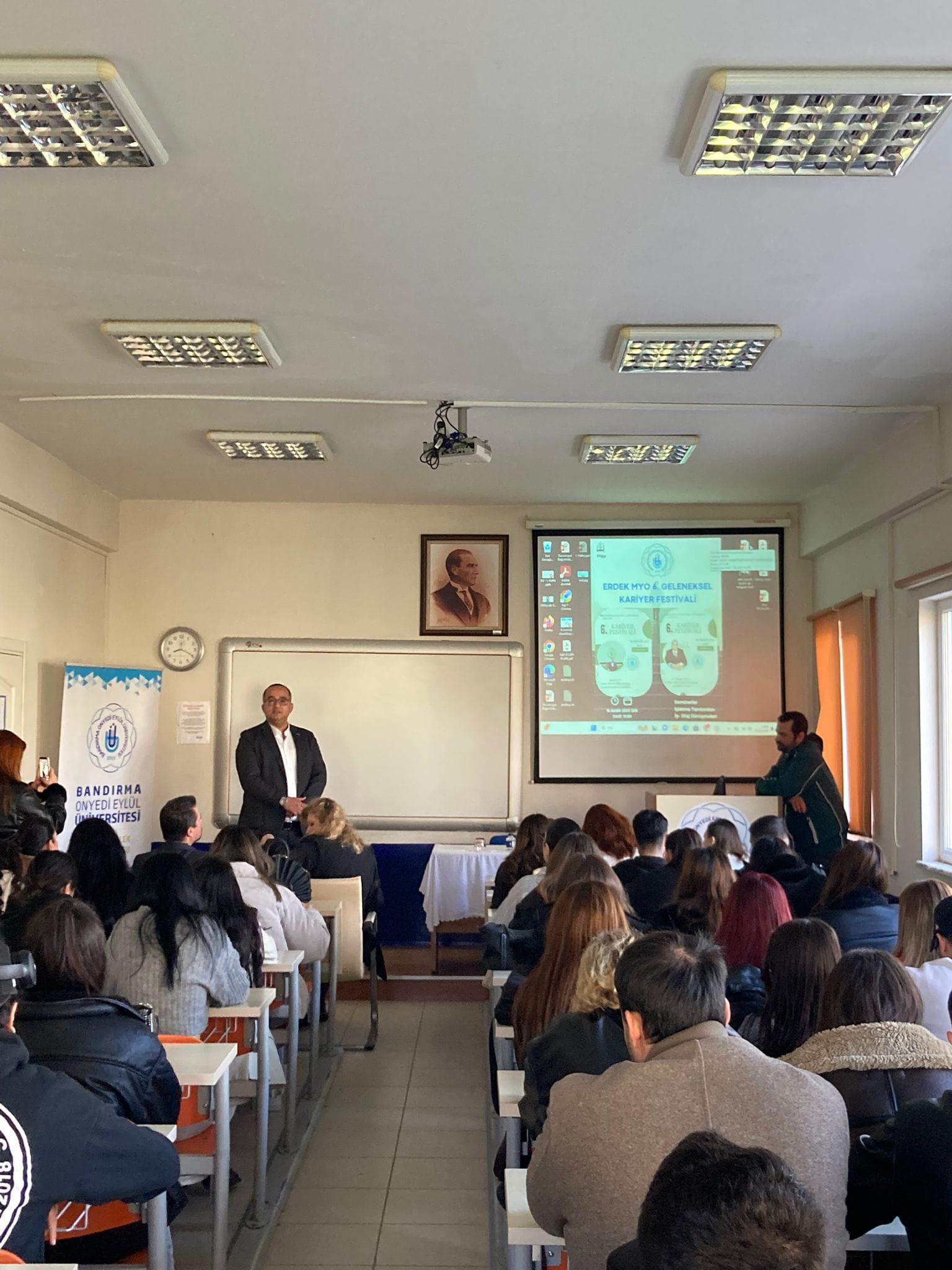 Meslek Yüksekokulumuz tarafından bu yıl altıncısı düzenlenen kariyer festivalinde Av. Serdar Polat öğrencilerimizle buluştu. Polat, “Kyzikos Antik Kenti’nin Kapıdağ Açısından Önemi” başlıklı söyleşisinde Kyzikos Antik Kenti başta olmak üzere Erdek’in tarihi yapılarını, doğal güzelliklerini ve kültürel zenginliklerini videolar eşliğinde göstererek bu değerlerimiz hakkında öğrencilerimize değerli bilgiler verdi. Kyzikos Antik Kentinde yürütülen kazı çalışmaları hakkında da bilgiler veren Polat, antik kentin Kapıdağ’ın turizmi için önemine dikkat çekti. Erdek’te turizmin on iki aya yayılması gerektiğini de belirten Polat, Kapıdağ bölgesindeki yürüyüş parkurlarının ziyaretçiler için önemli bir çekim unsuru olduğunu da sözlerine ekledi. Soru-cevap bölümüyle devam eden söyleşi Serdar Polat’a sunulan plaket takdimi ile son buldu.