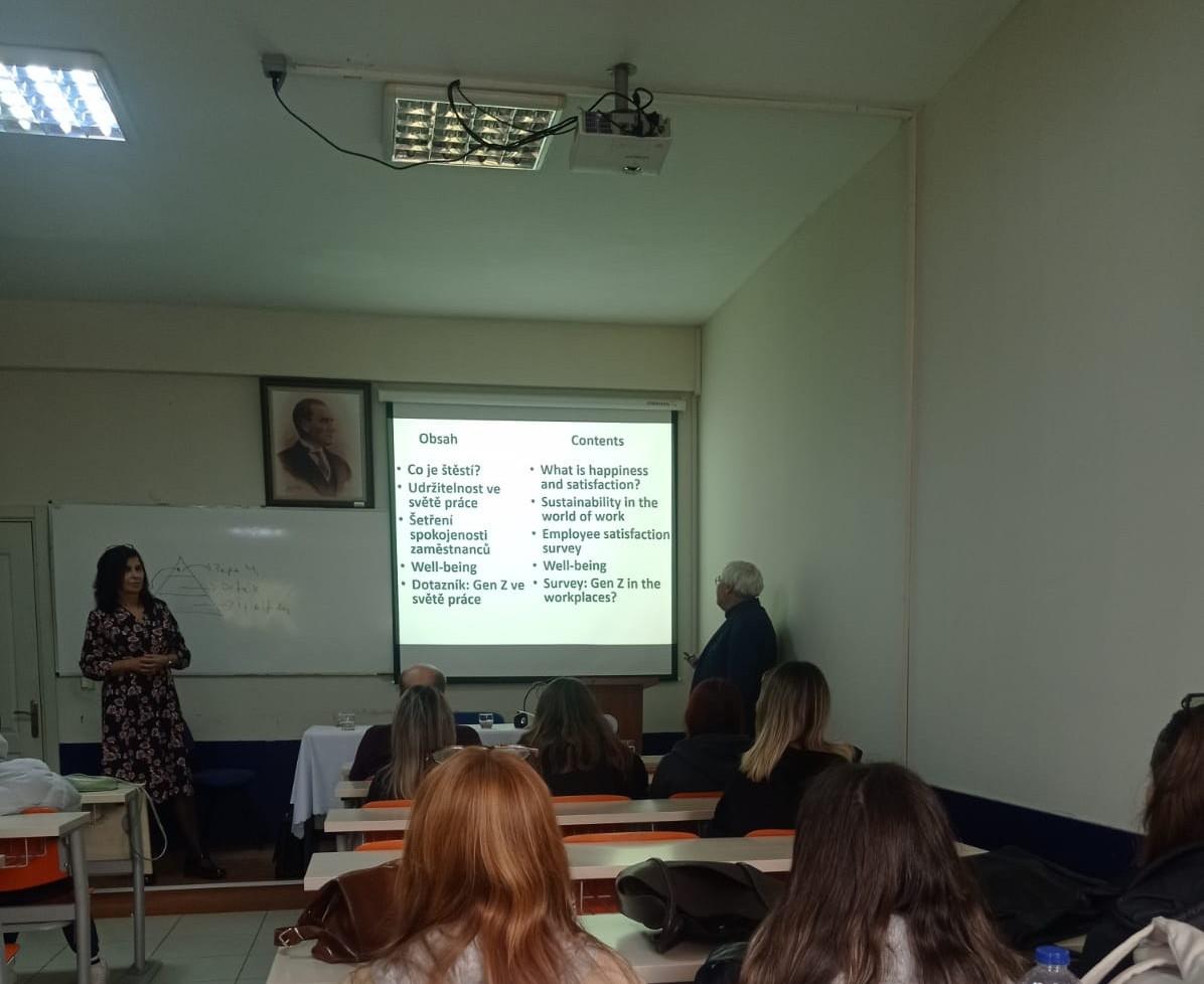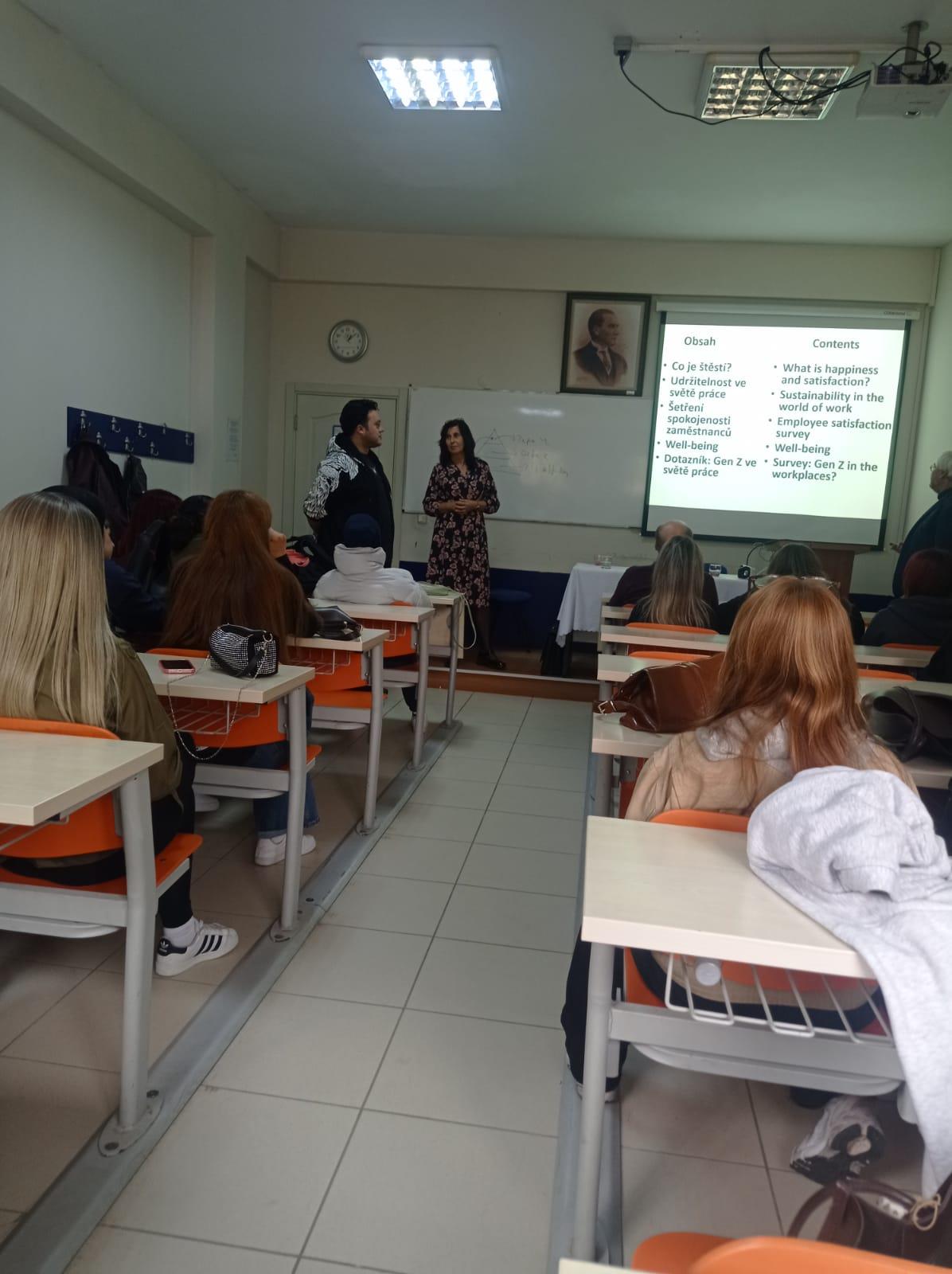 Çekya Pan European Üniversitesinde görev yapan öğretim elemanları PhDr. Eduard Entler, PhDr. Roman Koran, PhDr. Ivana Micinova ve PhDr. Pavel Sladek, üniversitelerinde Erasmus Öğrenci Değişim Programı kapsamında öğrenimini tamamlayan, üniversitemiz Siyaset Bilimi ve Kamu Yönetimi Bölümü Yüksek Lisans öğrencisi Doğukan Toptaş’ın önderliğinde ve tercümanlığında 30 Eylül 2025 Salı günü yüksekokulumuzu ziyaret ederek okulumuzda görev yapan öğretim elemanları ile başta Erasmus Programı olmak üzere iki kurum arasında düzenlenecek bilimsel etkinlikleri görüşmek üzere bir toplantı yaptılar. Toplantının ardından Sağlık Turizmi İşletmeciliği ve Yerel Yönetimler Programı öğrencilerimiz ile de bir araya gelen misafir öğretim elemanları “İşgören Memnuniyeti” ve “Z Kuşağını İşyerinde Tatmin Eden Faktörler” üzerine öğrencilerimize yönelik bir sunum gerçekleştirdiler.