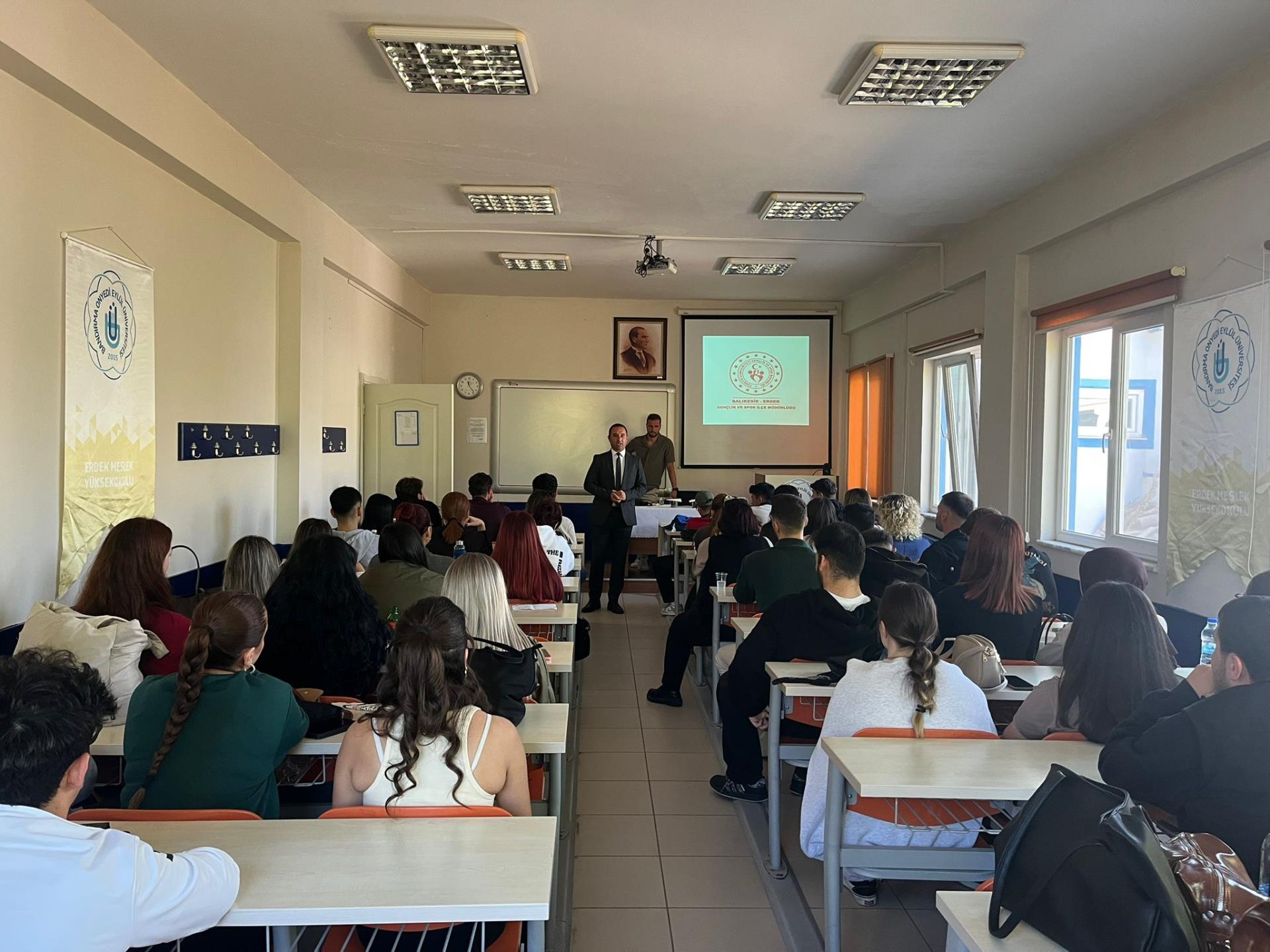 Erdek Gençlik ve Spor İlçe Müdürü Salman Koçu ve Spor Uzmanı Oğuzhan Keke ile GSB Genç Ofis Gençlik Lideri Fatih Özer, 1 Ekim 2025 Çarşamba günü öğrencilerimizle bir araya gelerek Gençlik ve Spor Bakanlığı ile üniversite iş birlikleri hakkında öğrencilerimize kıymetli bilgiler paylaştılar.