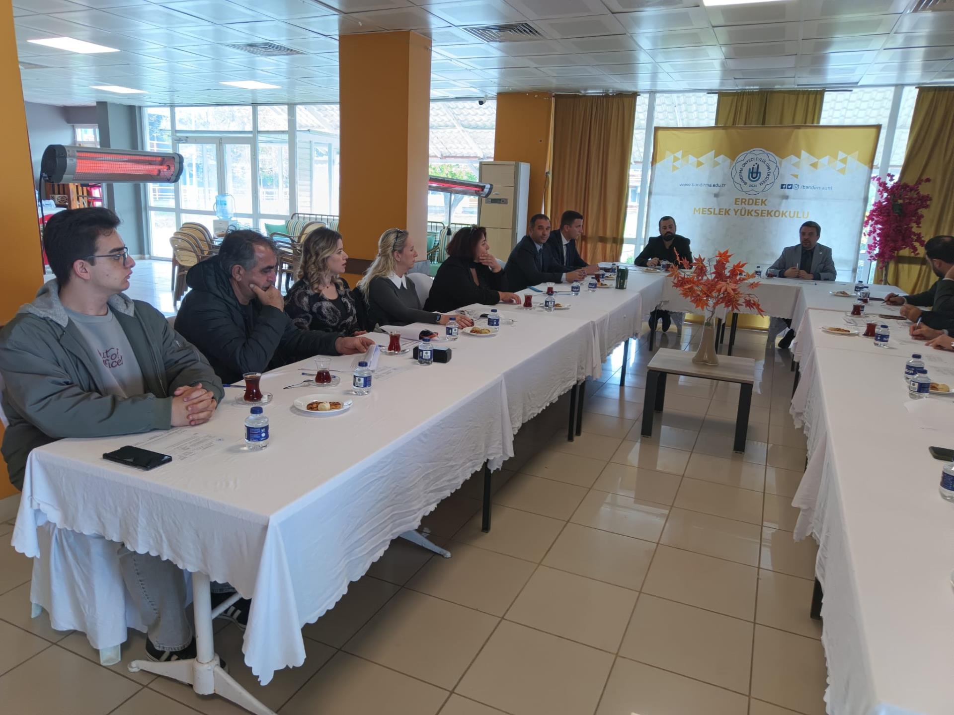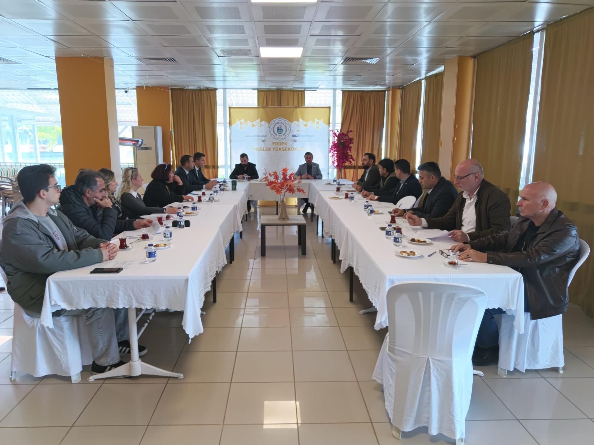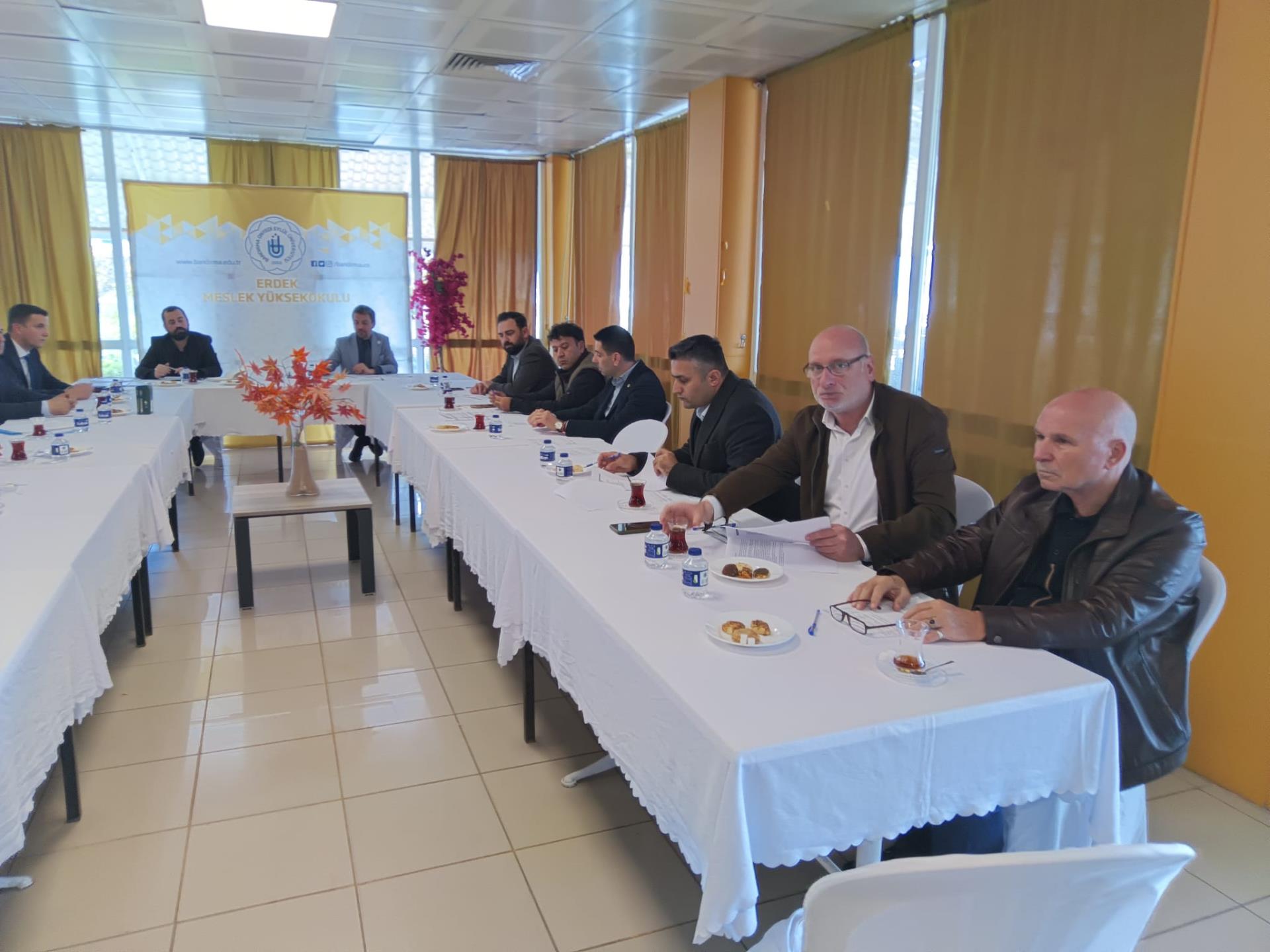 Meslek Yüksekokulumuz Danışma Kurulu toplantısı 28 Kasım 2025 tarihinde ve saat 11.00’de okulumuzda Yüksekokul Müdürümüz Doç. Dr. Samet ÇEVİK başkanlığında yapıldı. Toplantıda, Birim Danışma Kurulu Üyelerimizden Erdek Belediye Başkan Yardımcısı Hüseyin YILDIRIM, Erdek Gençlik ve Spor İlçe Müdürü Salman KOÇU, Erdek Halk Eğitim Merkezi Müdürü Mehmet Ali BÜYÜKTAŞ ile Müdür Yardımcısı Nalan ÜNER GÜNGÖR, Erdek Ticaret Odası Başkanı Hüseyin UZ ile Genel Sekreteri İhsan ÖZER, S.S. 162 Sayılı Erdek Zeytin Tarım Satış Kooperatifi Yönetim Kurulu Başkanı Abdullah ŞENOL, Erdek Şoförler ve Otomobilciler Odası Başkanı Aydın TEKİN, Erdek/Kiraz Otel İşletmecisi Halit AKYOL, Erdek Turizmi Geliştirme ve Dayanışma Derneği Başkanı Seval ÇETİN ile Erdek Meslek Yüksekokulu öğrencisi Kerem DÖNMEZ’in yanısıra Yüksekokul Müdür Yardımcılarımız Dr. Öğr. Üyesi Yasin TURNA ile Dr. Öğr. Üyesi Semih SARIİPEK, Otel, Lokanta ve İkram Hizmetleri Bölüm Başkanımız Doç. Dr. Melahat YILDIRIM SAÇILIK ve Yüksekokul Sekreterimiz Kenan BOZOĞLU hazır bulundu. Toplantıda, programlarımızın öğrenme çıktıları ve eğitim amaçları, kariyer festivali programı ve bahar yarıyılında yapılacak olan etkinliklerle ilgili gündem maddeleri görüşüldü.